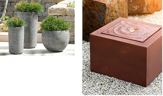 Inspired by nature, these planters and fountains have an impressively authentic look and feel. The difference: these unique surfaces are made from a high-quality fibreglass and mineral composite, making them up to 70% lighter than traditional natural stone fountains.